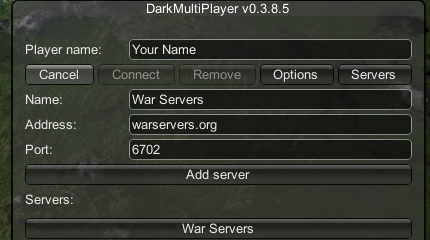 warservers.org:6702. If you want to see what that screen should look like, click example. Once DMP is updated, the server should be reachable whenever the status badge on this page shows online.